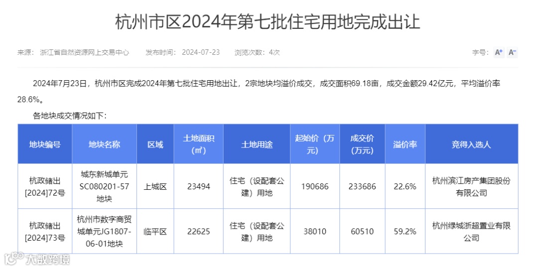 7月23日,杭州完成2024年第七批次住宅用地出让。从竞得人确定方式来看,本次土拍依旧实行自由竞价,按照“价高者得”的原则确定竞得人。值得一提的是,虽然本次只有两宗地块出让,但其中一地块以近60%的溢价成交。