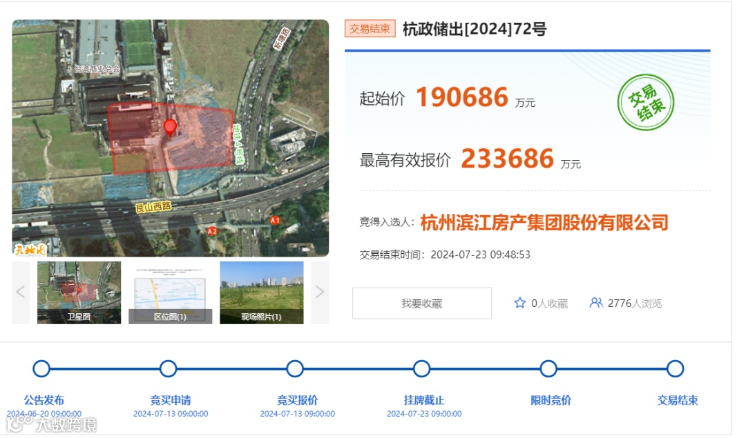 经过43轮报价,最终,杭州滨江房产集团股份有限公司以总价23.3686亿元竞得该主城区核心地块,溢价率22.55%,折合楼面价约35524元/平方米。