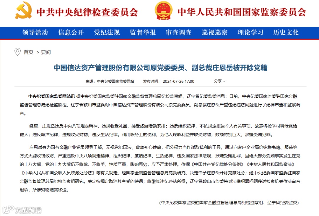 中国信达资产管理股份有限公司原党委委员、副总裁庄恩岳被开除党籍