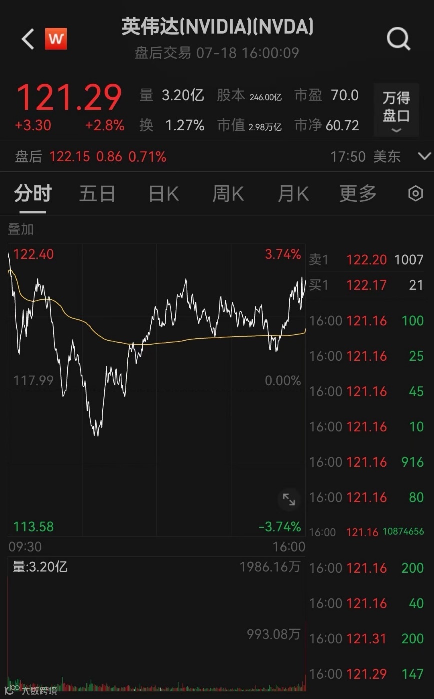7月18日,英伟达美股盘前一度涨超3%,盘中一度跌逾1%,收盘涨超2.8%,报121.29美元。