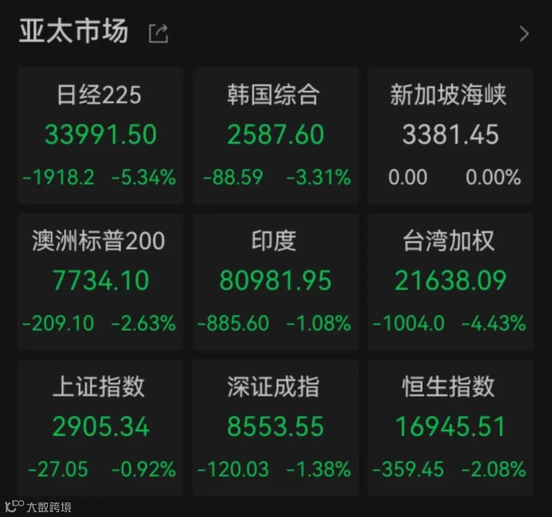据Wind数据,日经225指数、日本东证指数低开近2%,韩国综合指数低开逾2%。上述股指低开后持续走低,日经225指数盘中跌近6%,失守34000点关口;日本东证指数一度跌近8%且向下触发熔断机制。