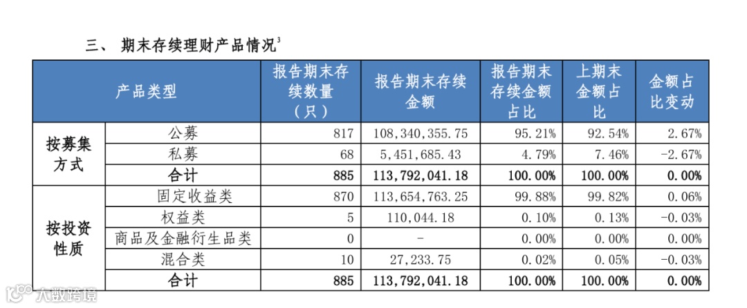 据浦银理财2024年上半年度理财业务报告,截至6月末,浦银理财的理财产品存续规模约1.14万亿元,较2023年底的约0.95万亿元,增长约20%。其中,固定收益类产品占其存续规模比例为99.88%。
