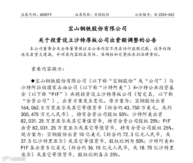 2023年4月7日,公司第八届董事会第二十八次会议审议通过了《关于参股沙特厚板公司及担保事项的议案》,同意宝钢股份与沙特阿美和PIF共同投资设立沙特厚板公司。原方案为:宝钢股份出资16.41亿里亚尔或其它等值货币(折合约4.38亿美元,或约30.05亿元人民币),持有合资公司股权50%;沙特阿美出资8.20亿里亚尔或其它等值货币,持有合资公司股权25%;PIF出资8.20亿里亚尔或其它等值货币,持有合资公司股权25%。