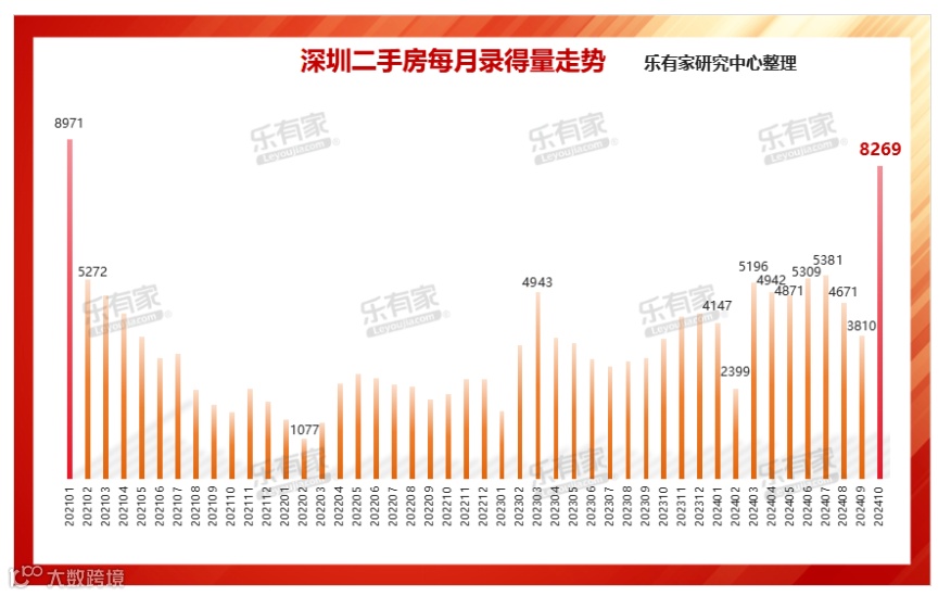 11月1日,深圳市房地产中介协会(简称“深房中协”)数据显示,10月深圳全市二手房签约量为8269套,环比增长117.0%,同比增长122.5%,创近45个月以来新高。反映出深圳“9·29”楼市政策效果显著,消费者信心回升明显。