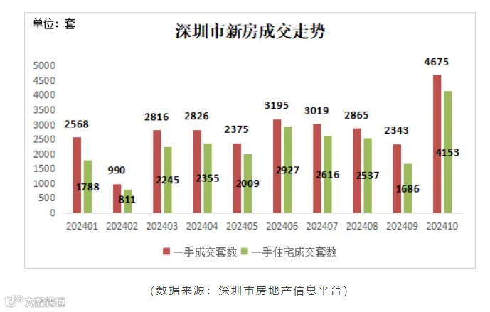 从整体数据看,10月深圳全市预售新房共成交4675套,环比增长99.5%,同比增长43.3%。其中住宅成交4153套,环比增长146.3%,同比增长56.5%。