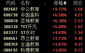 中公教育涨停,豆神教育、中国高科等跟涨。