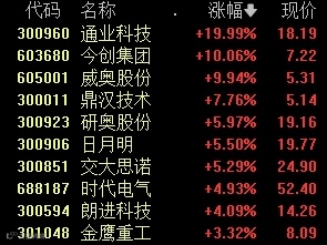 轨交设备板块全天上涨,通业科技20CM涨停。