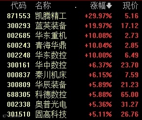 工业母机概念股大涨,蓝英装备20CM涨停,青海华鼎、华东重机直线拉升封板,华辰装备等纷纷冲高。