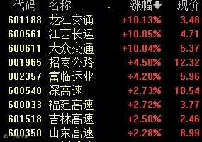 公路铁路运输板块临近尾盘异动拉升,龙江交通、江西长运、大众交通涨停。