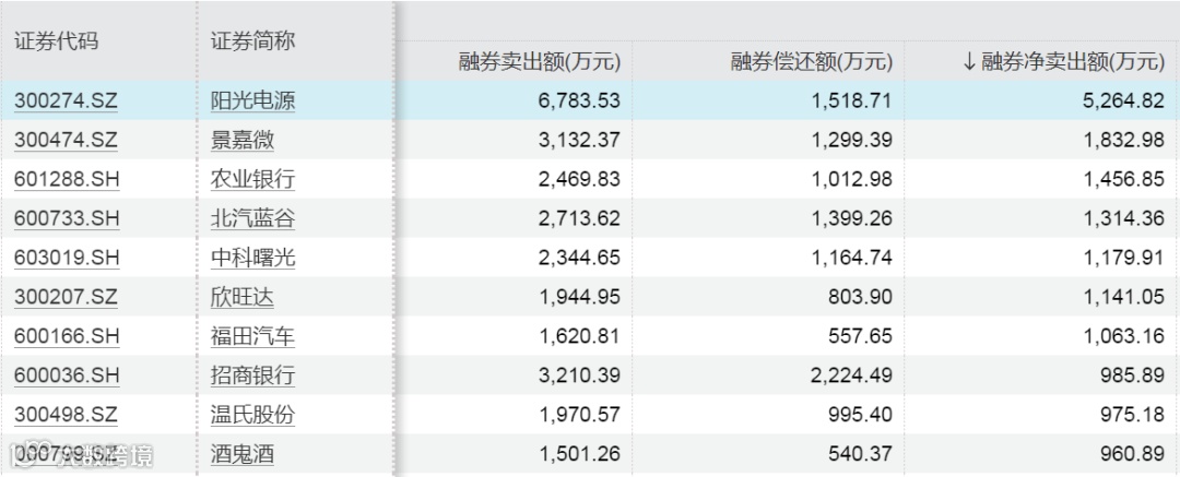 上周融券净卖出额居前的股票为阳光电源、景嘉微、农业银行,分别为5264.82万元、1832.98万元、1456.85万元。