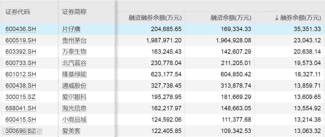 Wind数据显示,截至7月19日,A股市场融券余额居前的股票分别为片仔癀、贵州茅台、万泰生物,融券余额分别为3.54亿元、2.30亿元、2.06亿元。