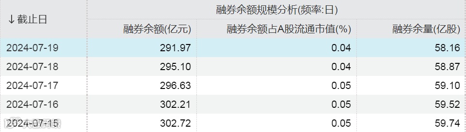 Wind数据显示,截至7月19日,A股市场融券余额为291.97亿元,创逾4年新低,融券余量为58.16亿股,上周融券余额减少17.70亿元。
