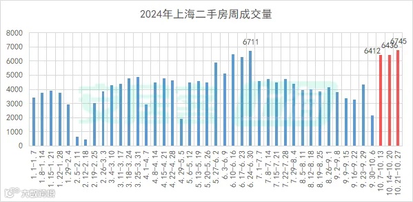 从安居客上海统计的单周数据来看,同样以10月21日至10月27日为例,上海二手房成交共6745套,超越今年6月最后一周,成为今年以来截至目前二手房成交量最高的一周。日均成交为964套,环比上涨4.8%。统计显示,今年国庆后已连续三周保持6400套以上的高位。