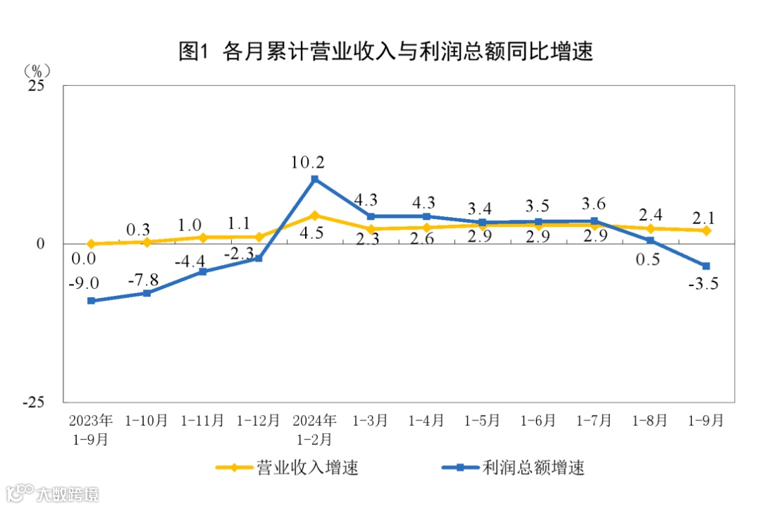 1-9月份,全国规模以上工业企业实现利润总额52281.6亿元,比1-8月份增加5754.3亿元,但是受有效需求不足、工业品价格下降及今年8月份以来同期基数明显抬高等多重因素影响,同比下降3.5%。主要原因有:一是从价格看,工业品出厂价格持续低迷,9月份工业生产者出厂价格指数降幅继续扩大,对企业收入和盈利形成较大压力;二是从收入看,1-9月份规上工业企业营业收入增长2.1%,增速较1-8月份回落0.3个百分点;三是从成本看,企业成本增速快于营收增速,导致企业毛利下降,对利润增长支撑不足。此外,今年8月份以来同期基数明显抬高也给利润恢复带来压力。