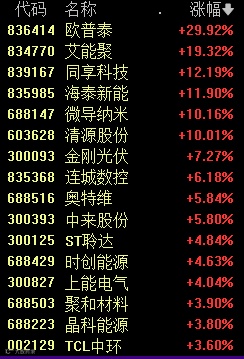 受此消息影响,今天上午,光伏概念表现活跃,其中,光伏设备板块大涨,欧普泰、艾能聚、同享科技等个股大涨。