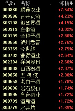 具体看,白酒板块中,迎驾贡酒、顺鑫农业等涨幅居前。