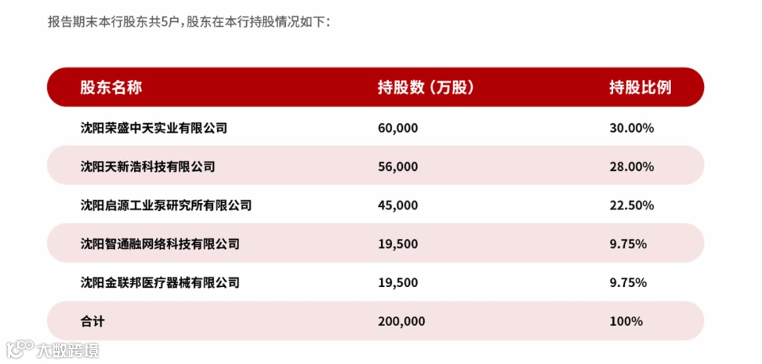 金融商贸开发区,注册资本20亿元,由沈阳荣盛中天实业有限公司、沈阳天新浩科技有限公司、沈阳启源工业泵研究所有限公司、沈阳智通融网络科技有限公司和沈阳金联邦医疗器械有限公司五家股东共同发起设立。该行于2016年获得筹建批复,2017年正式开业。