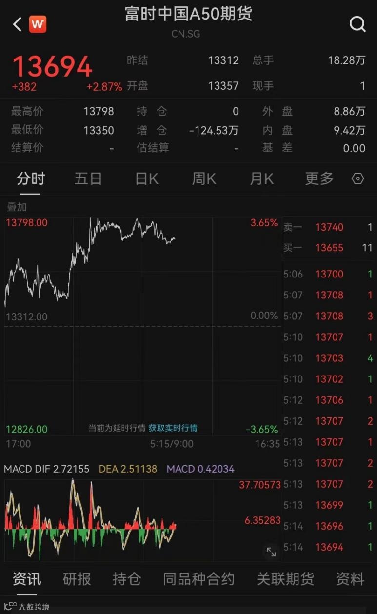 富时中国A50指数期货夜盘一度突破13700点关口