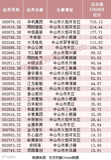 东财Choice数据显示,截至今年6月28日,A股注册地在中山的上市公司有26家,分别为华利集团、明阳智能、中炬高新、木林森、大洋电机等。