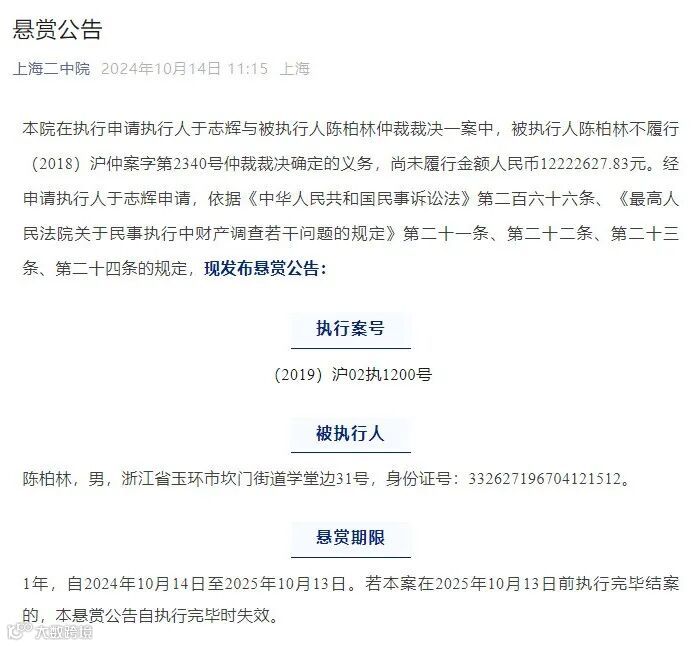 仲裁裁决一案中,被执行人陈柏林不履行(2018)沪仲案字第2340号仲裁裁决确定的义务,尚未履行金额人民币12222627.83元。经申请执行人于志辉申请,依据相关规定,上海二中院发布悬赏公告。