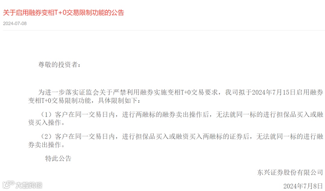 7月9日,有消息称东兴证券向投资者发布了关于启用融券变相T+0交易限制功能的通知。中国证券报记者查询东兴证券官网发现,该公司昨日便已发布相关公告,宣布自7月15日启用融券变相T+0交易限制功能。