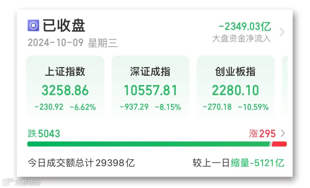 截至收盘,上证指数跌6.62%,深证成指跌8.15%,创业板指跌10.59%。沪深两市全天成交额2.94万亿元,较上个交易日缩量5121亿元。