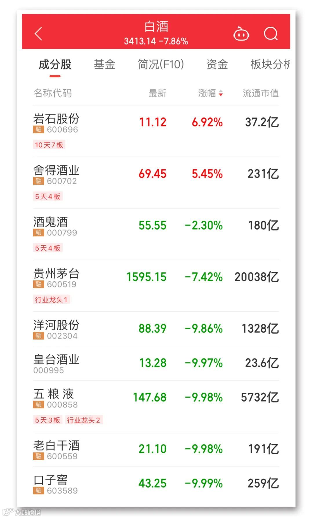 今天,白酒板块表现弱势,板块内个股多数飘绿。截至收盘,岩石股份涨近7%,舍得酒业涨超5%。