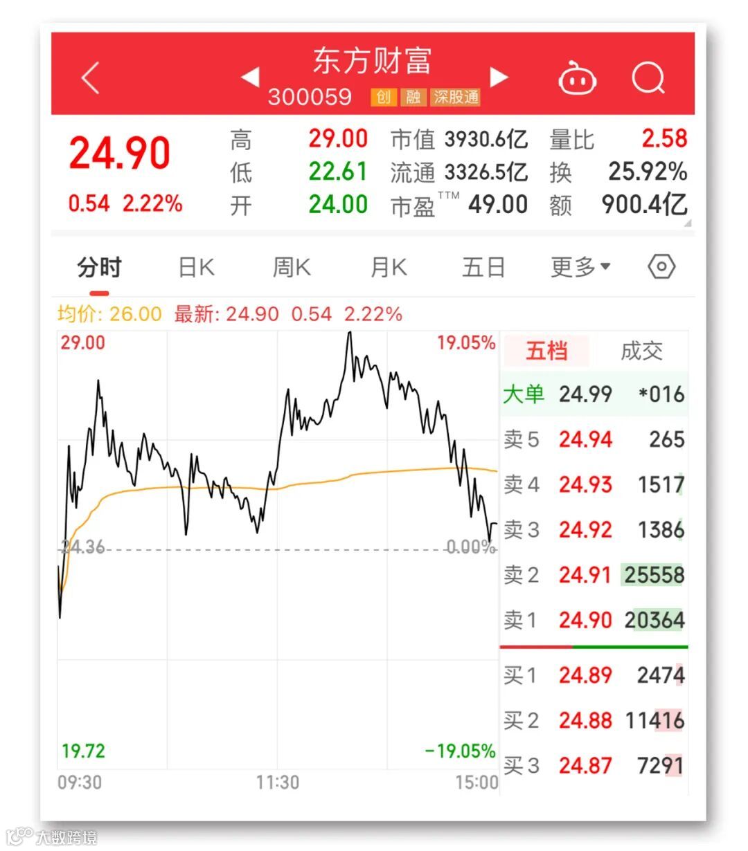 多只个股再现超百亿元成交额。13:34,东方财富成交额突破700亿元,打破此前中国石油在2007年11月5日创下的699.9亿元的A股个股单日成交额纪录。14:32,东方财富成交额突破800亿元。截至收盘,东方财富成交额900.4亿元,该股居个股人气榜第一位。中信证券成交额422亿元,宁德时代、中芯国际成交额均超200亿元,贵州茅台、中国平安、同花顺、软通动力等13只个股成交额超百亿元。