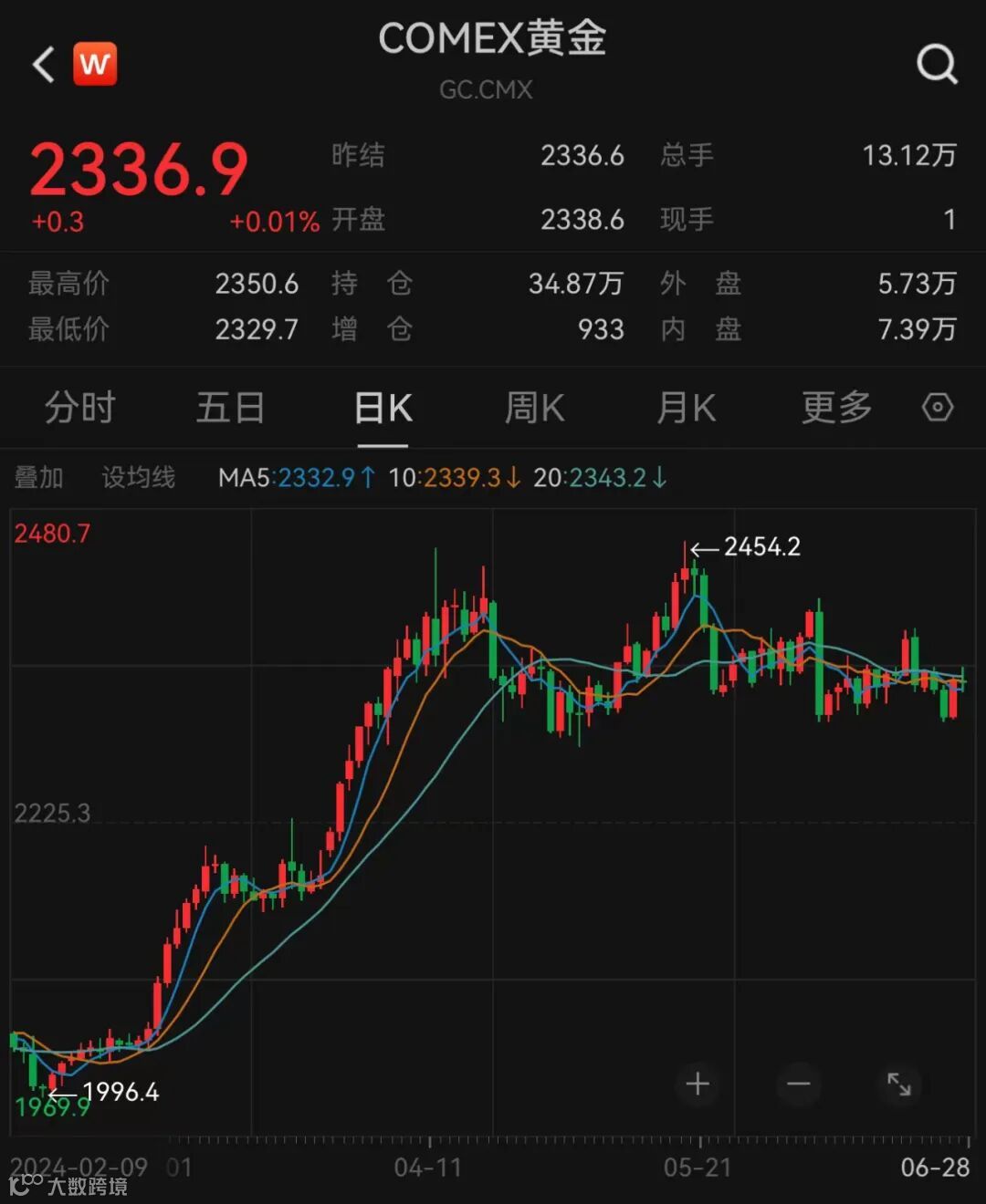 本周,现货黄金价格以轻微的跌势收盘,最终月度跌幅为0.10%。值得关注的是,2024年上半年黄金累计上涨超12.78%,显示出黄金在不确定性增加的市场环境中保持了其吸引力。COMEX黄金期货也有相似的涨幅,上半年累计上涨12.8%,COMEX白银期货更是收获22.52%的涨幅,显示出贵金属整体的强劲表现。