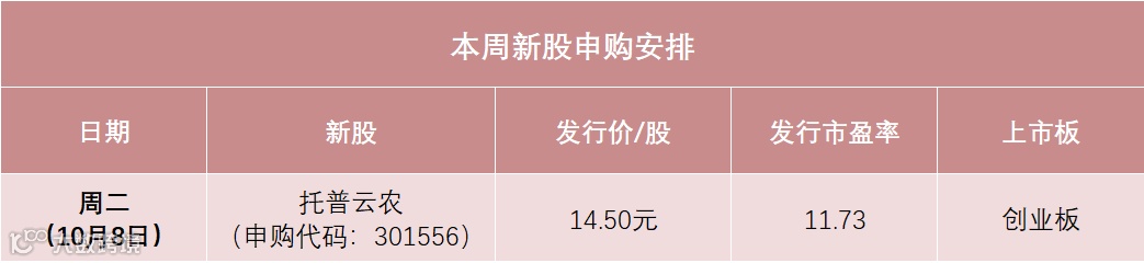 明天(10月8日)是A股国庆节后的第一个交易日,有1只新股申购,为创业板新股托普云农。