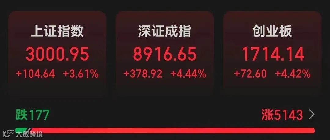 此外,深证成指涨4.44%,创业板指涨4.42%。全市场超5100只股票上涨,除ST股外,仅有大唐电信一只股票跌停。