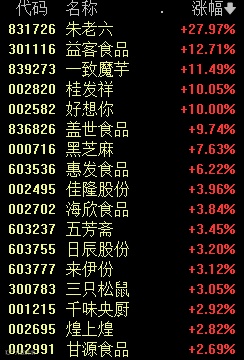 今天上午,食品饮料板块继续上涨,桂发祥、好想你、一鸣食品等多股涨停。