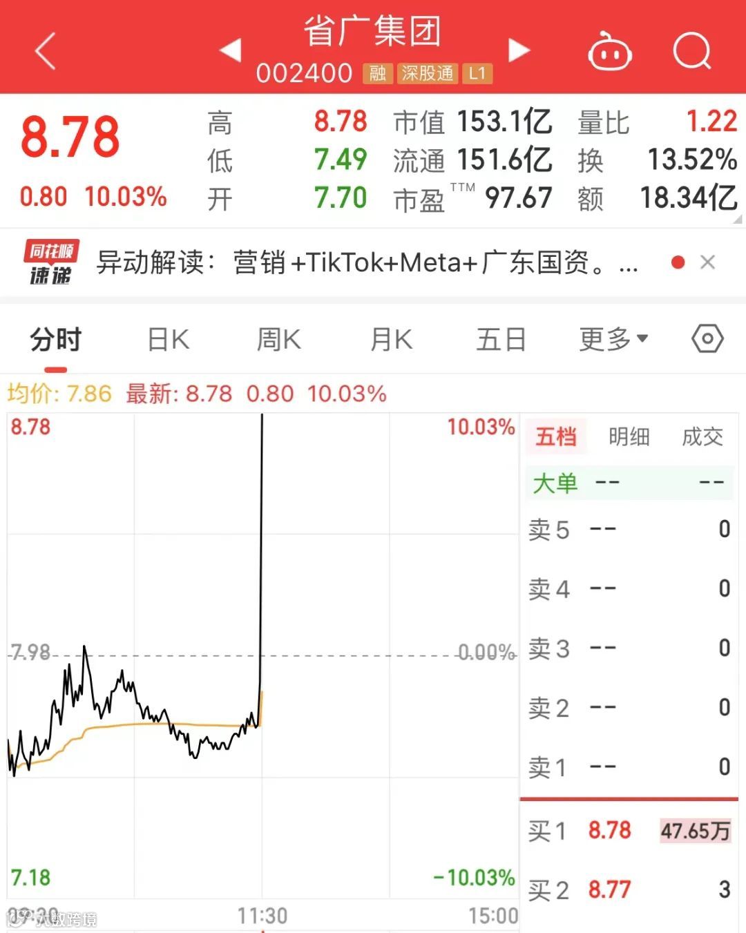 抖音概念股上午临近收盘开始拉升,龙头股省广集团(002400)则是在上午收盘前最后一分钟直线涨停。
