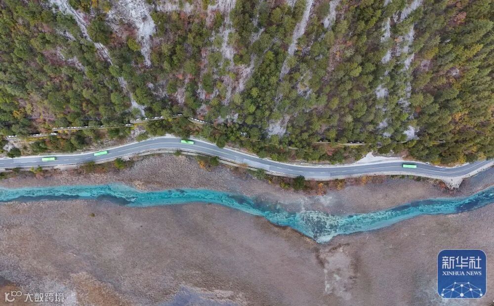 11月16日,观光车行驶在九寨沟景区芦苇海旁的公路上(无人机照片)。新华社记者 王曦 摄