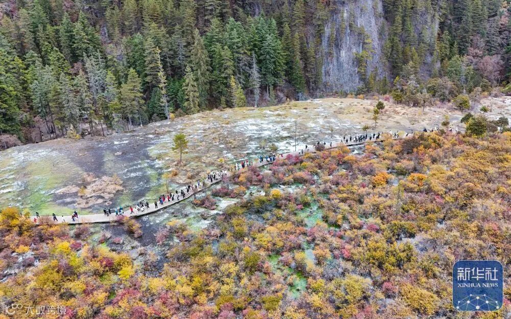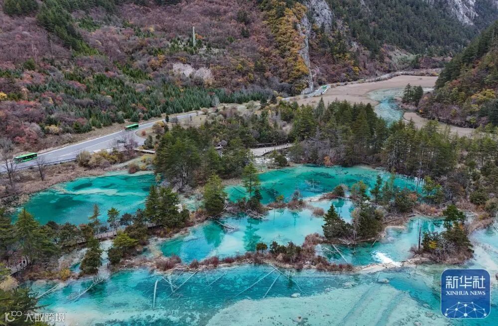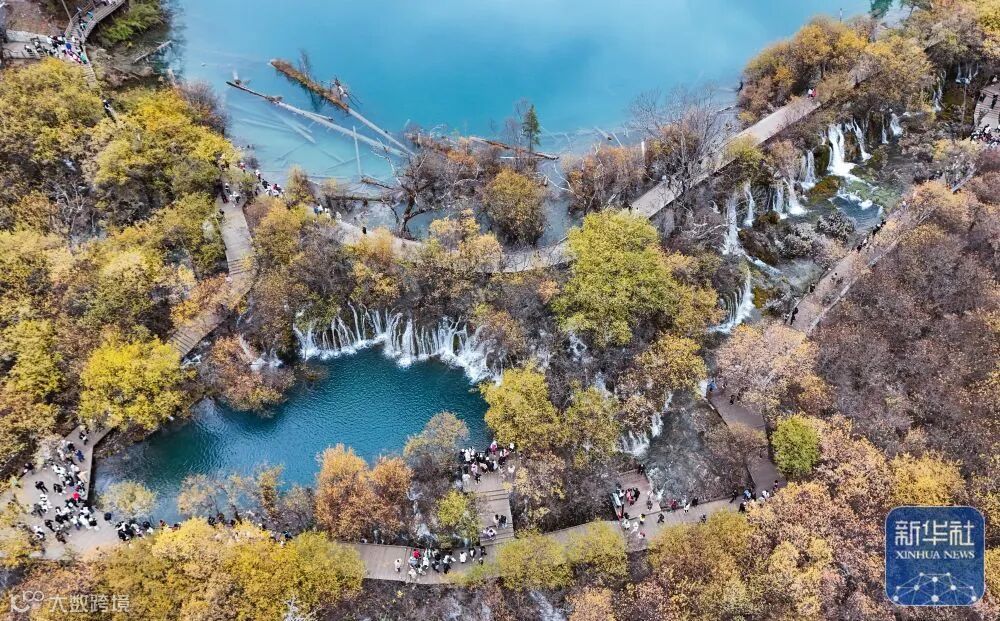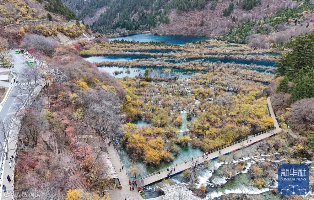 11月16日,游客在九寨沟景区树正群海观光(无人机照片)。新华社记者 刘莲芬 摄