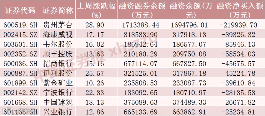 上周融资客减仓居前的10只股票分别为贵州茅台、海康威视、韦尔股份、顺丰控股、招商银行、伊利股份、紫金矿业、