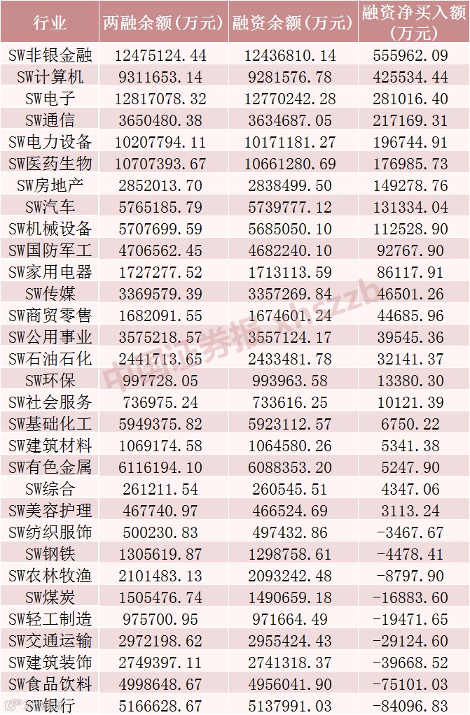 从行业情况来看,上周申万一级31个行业有22个行业融资余额增加,非银金融、计算机、电子行业融资余额增加居前,增加金额分别为55.60亿元、42.55亿元、28.10亿元。