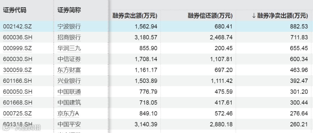 上周融券净卖出额前十股票