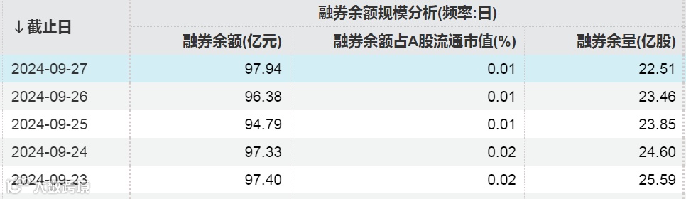 Wind数据显示,截至9月27日,A股市场融券余额为97.94亿元,结束连续11周的减少,上周融券余额增加0.75亿元,融券余量为22.51亿股,上周融券余量减少3.01亿股,融券余额的增加主要是因为市场大涨带来的股价上涨。