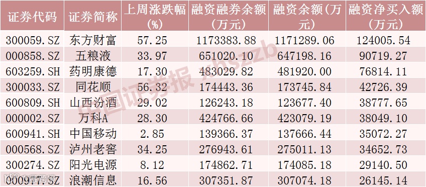 老窖、阳光电源、浪潮信息,分别净买入12.40亿元、9.07亿元、7.68亿元、4.27亿元、3.88亿元、3.80亿元、3.51亿元、3.47亿元、2.91亿元、2.61亿元。从市场表现上看,上周融资客加仓居前十的股票全线上涨,涨幅最大的东方财富涨逾57%,涨幅最小的中国移动涨逾2%。