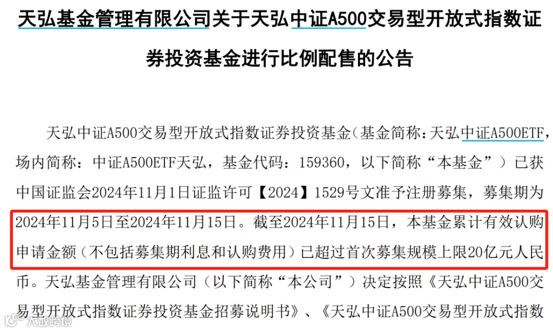 11月16日,鹏华基金、天弘基金、博时基金相继发布旗下中证A500ETF进行比例配售的公告,均称旗下中证A500ETF募集期间累计有效认购申请金额已超过首次募集规模上限20亿元。