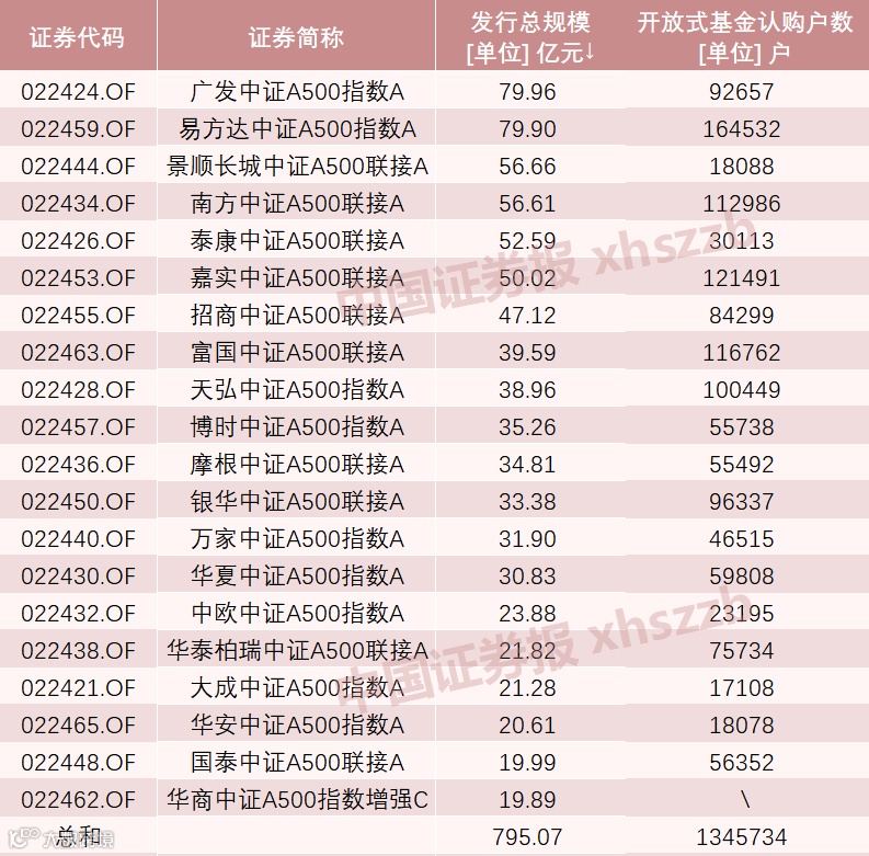 本周,随着银华基金宣布银华中证A500ETF联接基金成立,首批中证A500场外基金募集情况正式揭晓,数据显示,首批20只中证A500场外基金共“吸金”795.07亿元,接近800亿元。