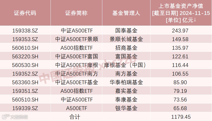 截至11月17日,目前已上市的首批10只中证A500ETF总规模达到1179.45亿元。其中,国泰基金、景顺长城基金、招商基金、富国基金、摩根基金、南方基金旗下的中证A500ETF规模已突破100亿元。