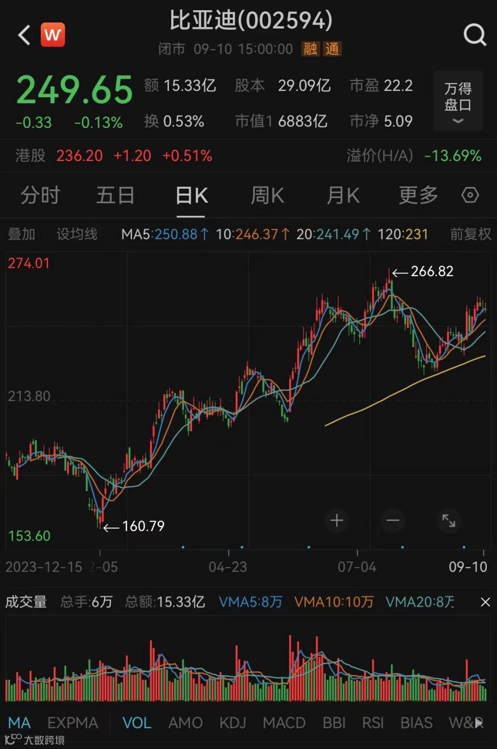 从二级市场表现看,今年以来,比亚迪迎来一波上涨行情,公司股票自2月初低点至今累计上涨47.89%,目前市值为6883亿元。