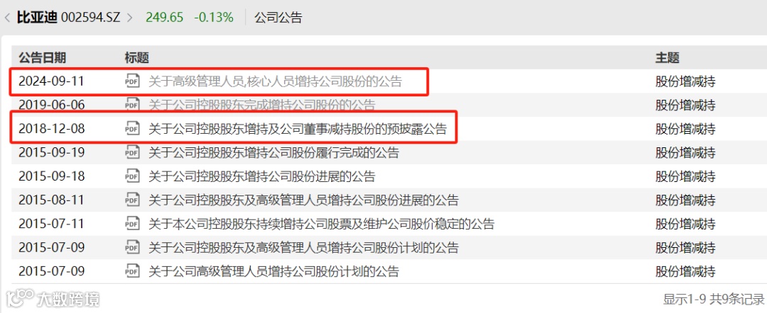 9月10日晚间,比亚迪公告,公司高管及核心人员在9月2日至9月9日期间增持公司A股股份合计14万股,增持金额合计3545万元。