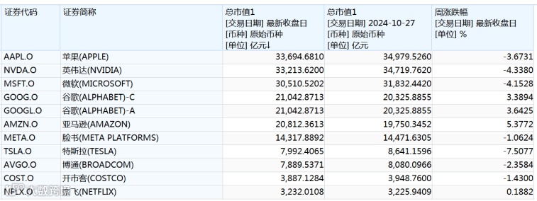 本周美股大型科技股涨跌不一,苹果、英伟达、微软、