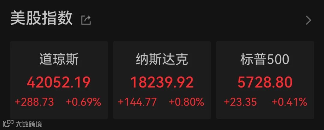 Wind数据显示,截至11月1日收盘,道指涨0.69%报42052.19点,标普500指数涨0.41%报5728.8点,纳指涨0.8%报18239.92点。本周,道指跌0.15%,标普500指数跌1.37%,纳指跌1.5%。