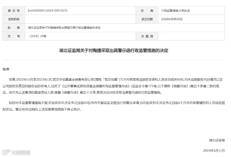决定对基金代销机构伯嘉基金及时任法定代表人、董事长兼总经理江翔分别采取暂停办理相关业务12个月、认定不适当人选的行政监管措施。自监管措施决定作出之日起3年内,江翔不得担任证券公司、基金销售公司、证券投资咨询公司的董监高和分支机构负责人职务或实际履行前述职务