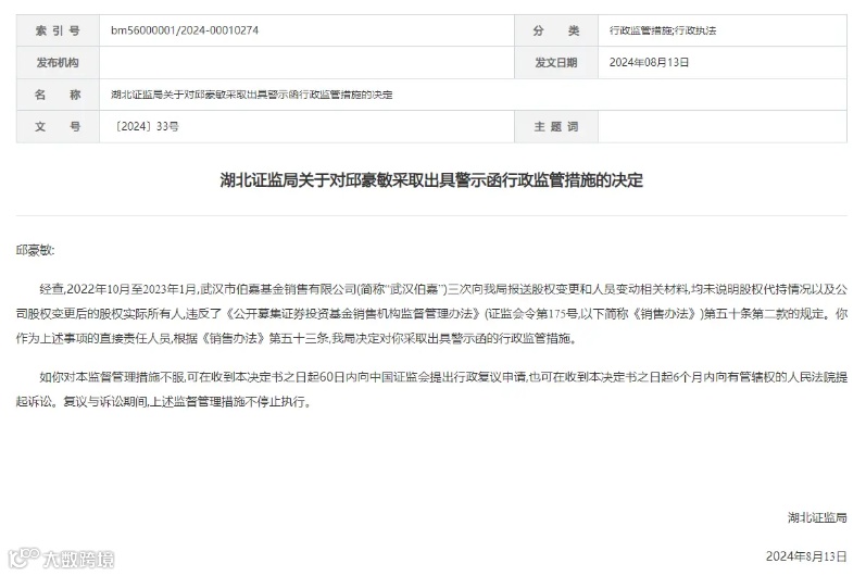 日前,湖北证监局最新披露显示,决定对基金代销机构伯嘉基金及时任法定代表人、董事长兼总经理江翔分别采取暂停办理相关业务(《公开募集证券投资基金销售机构监督管理办法》第五十四条涉及的全部业务)12个月、认定不适当人选的行政监管措施。