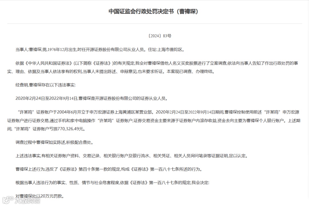 中国证监会官网近日披露一份出具给曹禕琛个人的行政处罚决定书。文件显示,曹禕琛曾是开源证券的证券从业人员。2020年2月24日至2022年9月14日期间,曹禕琛控制使用他人证券账户违规炒股,亏损770326.49元。